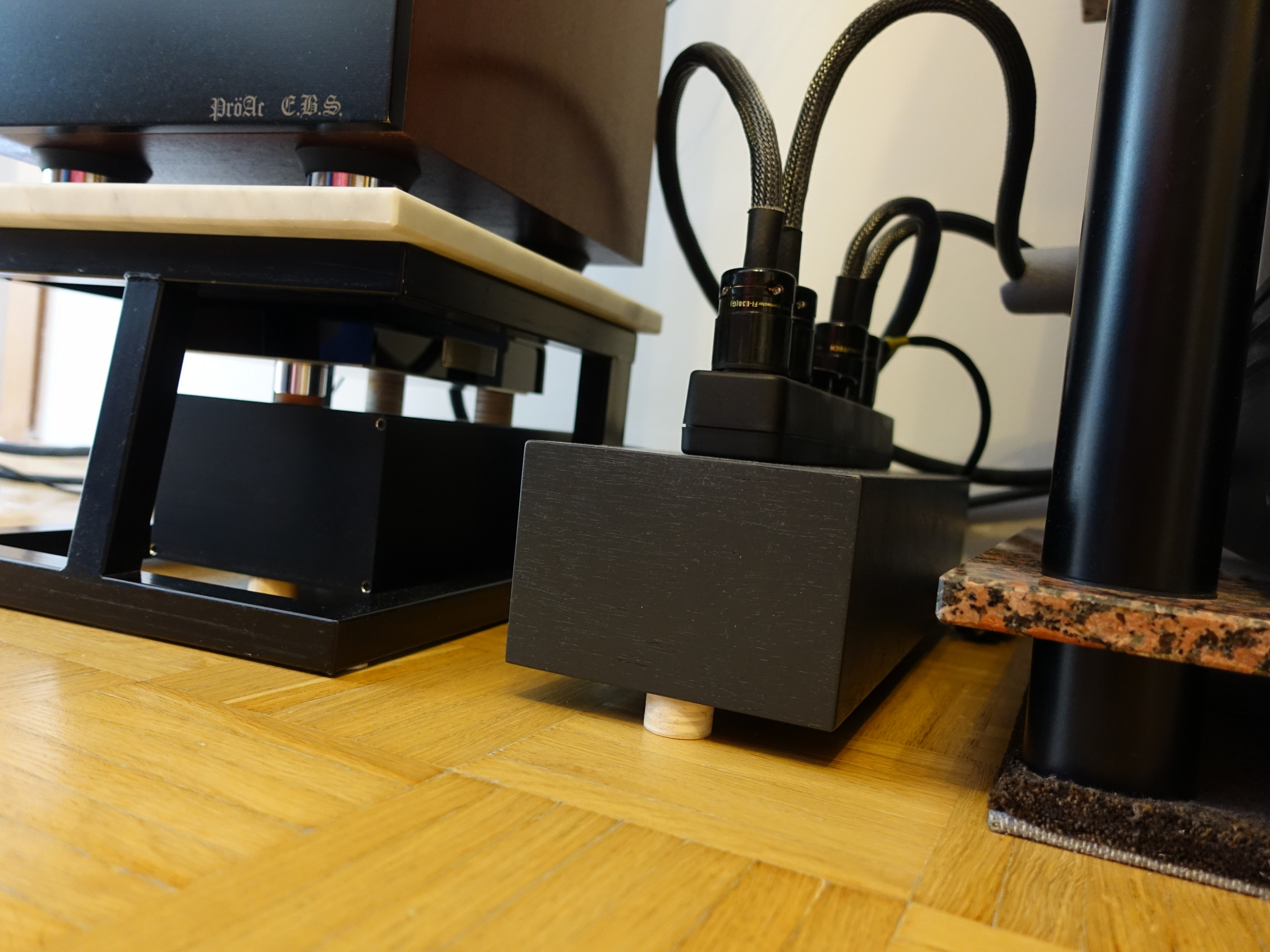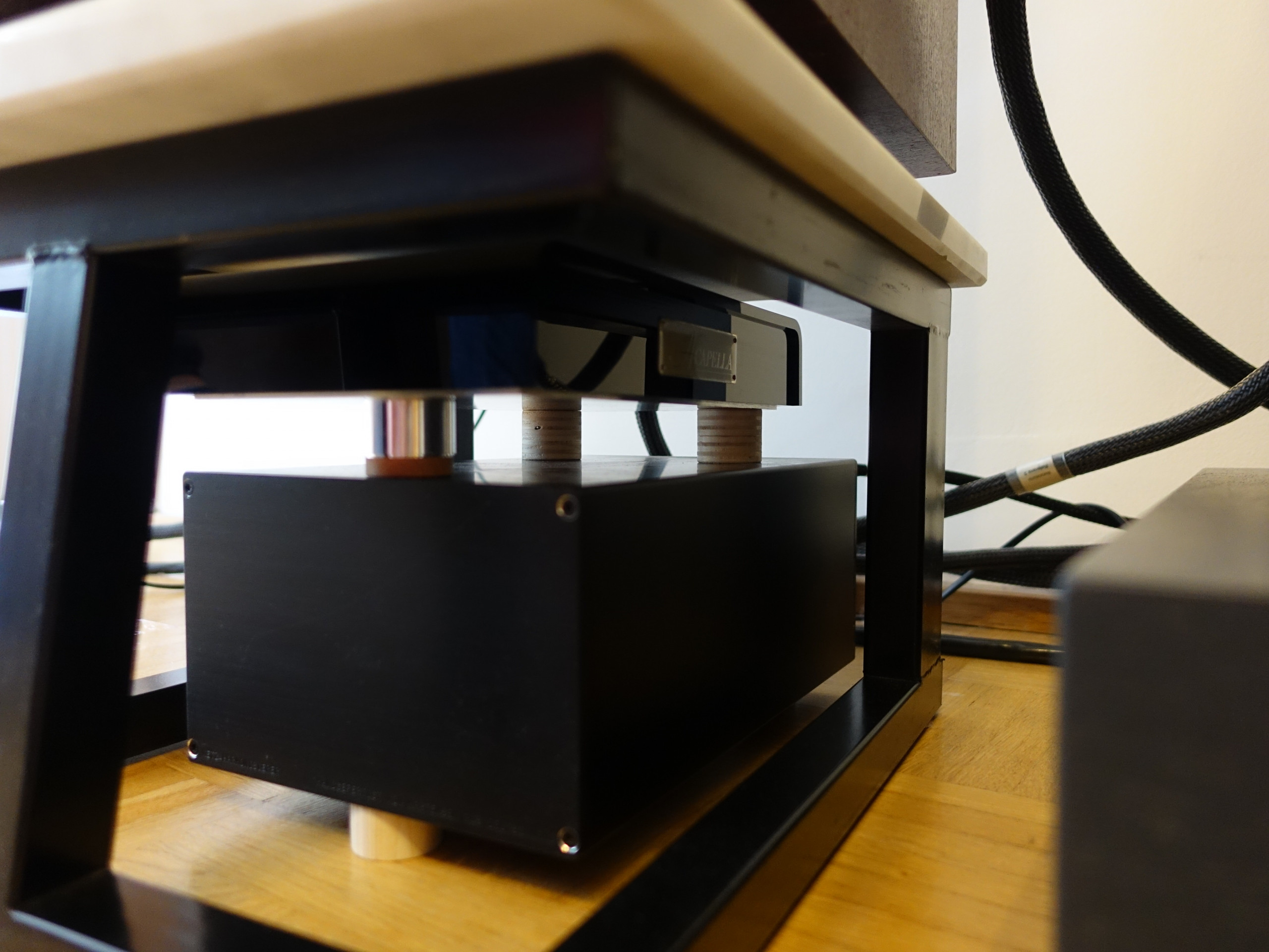 Nach ein paar Tagen bot mir Herr Swoboda an, mein Gerät persönlich bei mir zu Hause anzuliefern und in Betrieb zu nehmen. Gesagt, getan und schon standen Herr Swoboda und Herr Knipping mit meinem „neuen” Player und diversen Boxen und Koffern ein paar Tage später „auf der Matte“. Die ersten Hörtests mit dem Player waren deutlich besser als mit dem Alt-Gerät, aber ein WOW-Effekt blieb aus. Herr Swoboda setzte ein Pokerface auf und bot an, meine HiFi-Anlage ersten Optimierungen zu unterziehen. Die Herren machen sich ans Werk und mich beschlich der Verdacht, dass meine Anlage doch arg in die Jahre gekommen sei und wie ein altes Auto nicht mehr klanglich mithalten kann.
